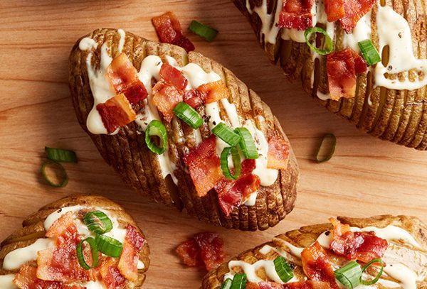 2. Dans un grand bol, mélanger les pommes de terre, le fromage, l’oignon, la soupe, la crème sure, le sel, le poivre, la moitié du bacon et la moitié du beurre fondu. Bien mélanger pour obtenir un mélange homogène.